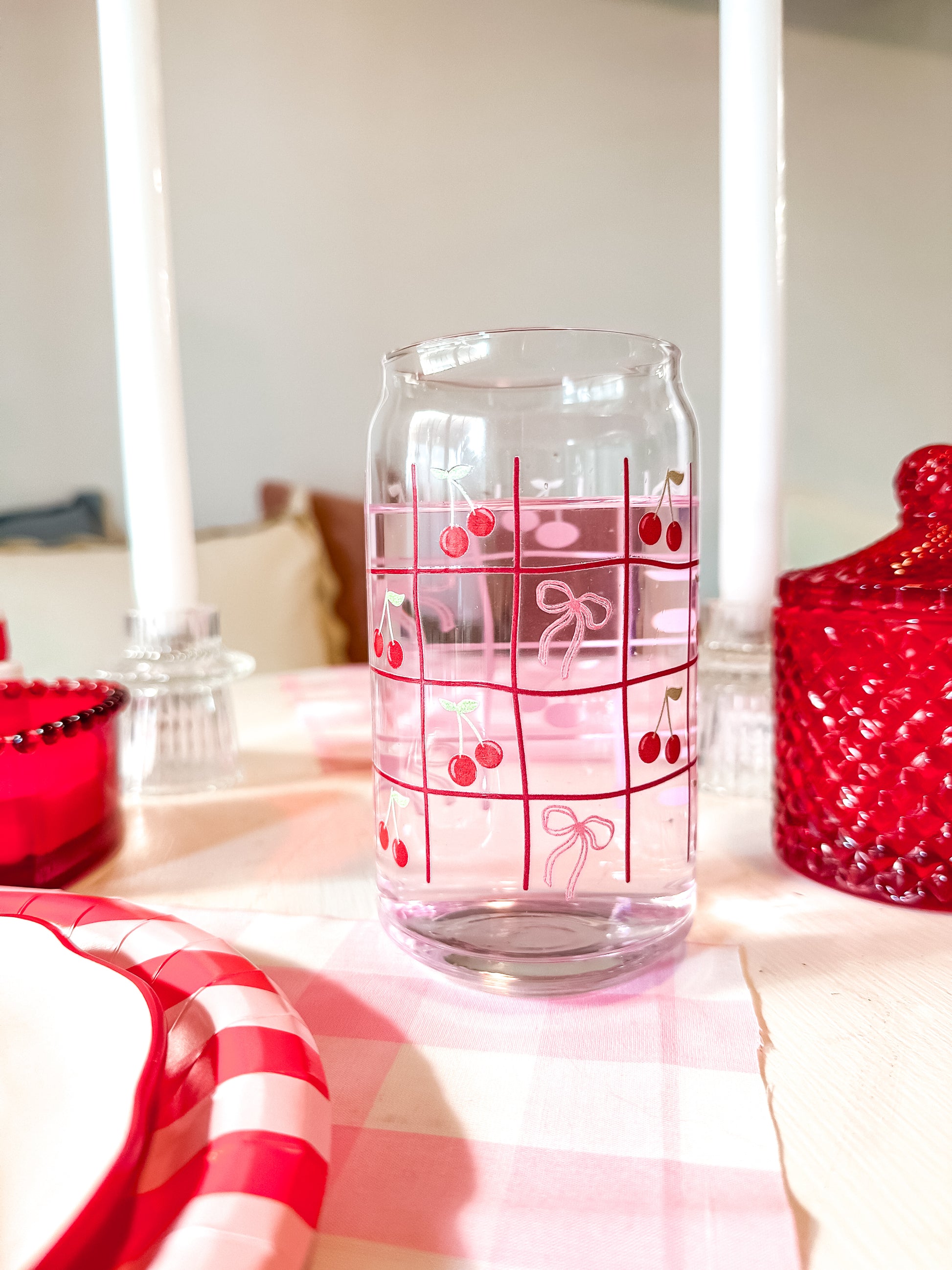 Sweet, simple, and just the right amount of charm — the Mon Chéri Glass Tumbler brings a cherry-on-top moment to your everyday routine. Featuring original hand-drawn cherry artwork, this 16 oz glass cup is perfect for iced coffee, matcha, tea, or water and makes every sip feel like a treat.